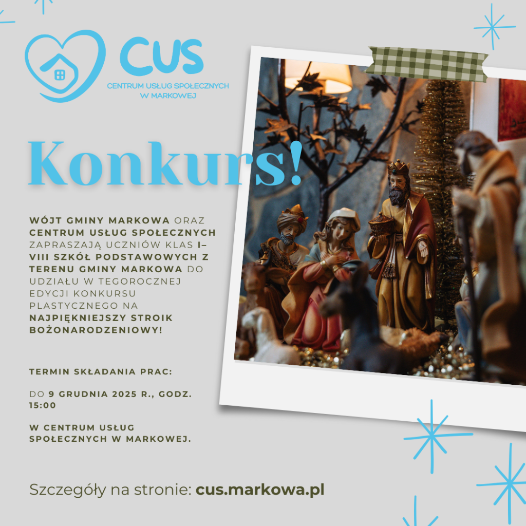 Wójt Gminy Markowa oraz Centrum Usług Społecznych w Markowej zapraszają uczniów klas I–VIII szkół podstawowych z terenu gminy do udziału w konkursie plastycznym na Najpiękniejszy Stroik Bożonarodzeniowy.